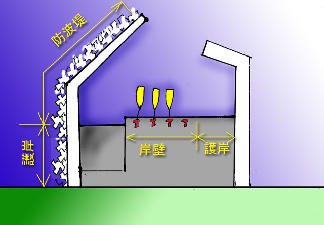 右図は漁港を上空から眺めた絵ですが、ひとくちに防波堤といっても 岸と接しているところは護岸と呼びます。また、船をつなげるピットがあるところを 岸壁と言い、同一直線上でもピットの無いところは、護岸です。