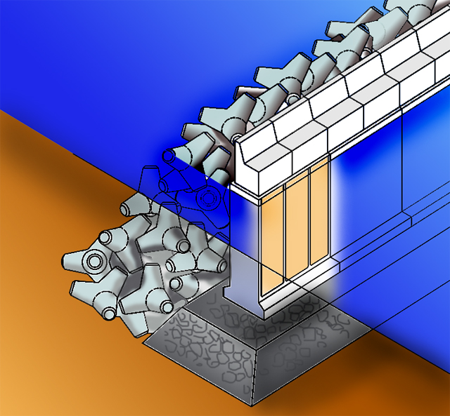この部分のおかげで防波堤は波を跳ね返します。重量も重くなって、より強い波も消してくれるようになります。