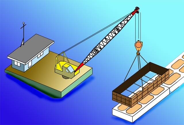 壁厚さを40cmとすると重量は概略1,000トンになりますがそのケーソンが押しのけた水は 1,575m3で海水比重を1とすると浮力は1,500トンあまり有り、500トン分すなわち9mほど浮かぶことになります(500÷2.3÷表面積)。これでは安定しないので2mほど浮いた状態になるように砂や水を入れて調整しておきます。2mほど頭を出し、プカプカ浮いたケーソンを起重機船で基準線(法線:ほうせん)に据え付けます。測量しながら法線を合わせ、OKならばポンプで注水してケーソンを海底に着地させます。水が満タンに入ったところで据付完了となります。ケーソンは押しのけた水の量だけ浮力が働いていますが注水することによって浮力を失い基礎捨石上に着底します。船が浮かんでいるのも、浸水して沈没するのも、この原理のとおりです。