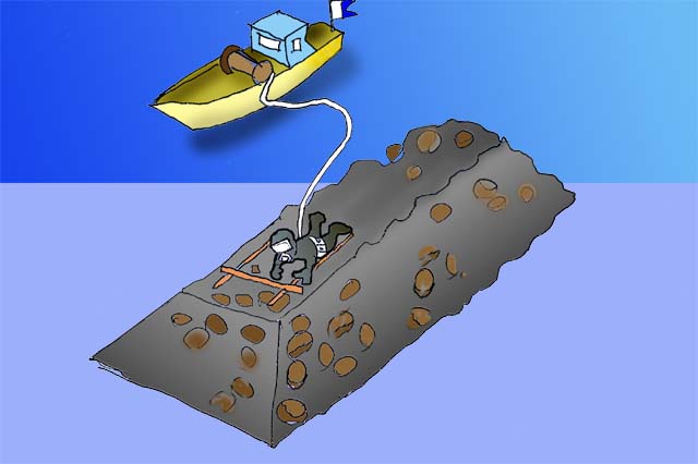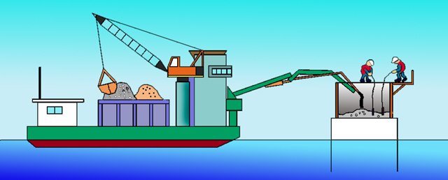 この配合をするのがミキサー船という特殊な船です。イラストに描いています。船体に砂と、セメント、砂利、水をたくさん積んでいて、仕事に必要なだけを