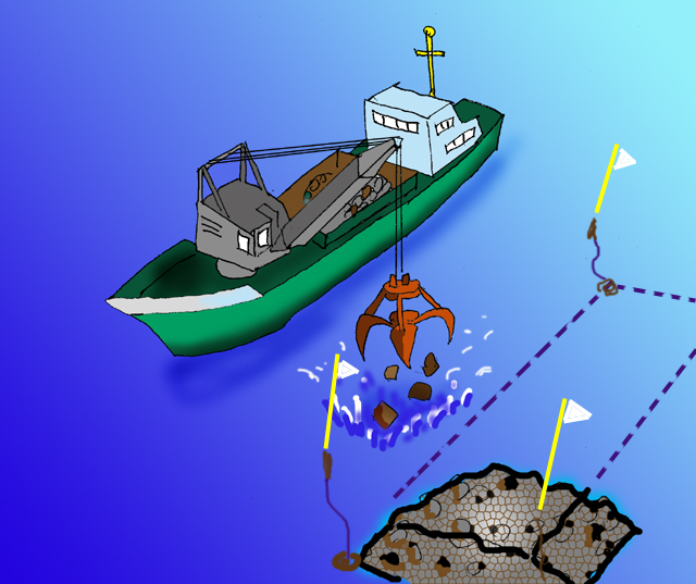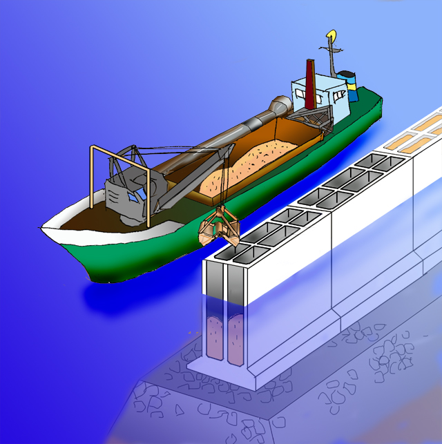 右図で砂船の右舷にあるのが砂採取用のポンプでこれを斜めに海底まで下げて砂を吸い上げます。ところがたくさん砂を取りすぎてだんだん海底が深くなってしまいパイプでは届かなくなってきたので最新鋭の砂船は図のような鉄管ではなくゴム製のパイプでリール状に搭載していて、より深いところでも採取できるようになっています。現在日本では砂の採取規制が厳しくなり、大きなプロジェクトでは海外からも輸入していることもあります。図は判りやすいようにケーソンの端部を断面図で描いています。
