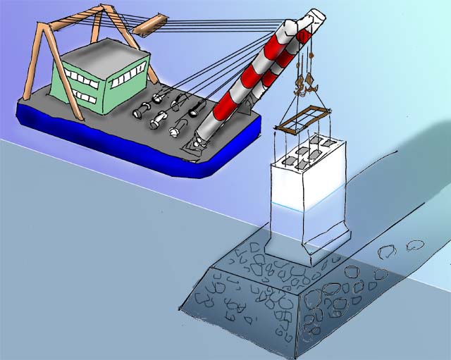上部工のコンクリートが決められた堅さになったあとに消波ブロックをクレーン船で陸上から持って来て設置します。 テトラポッドが一般に有名ですが、いろいろな種類の物が工事に使われています。 また、波の大きなところには、ひとつで60トンもある消波ブロックが使われますが、波の小さなところには2トンや4トンといった小さな物が使われます。 それぞれ、あらかじめ陸上でコンクリートをワクに流し込んで作っておきます。十分に堅くなった頃にクレーン船で防波堤まで持ってきて 並べてゆきます。
